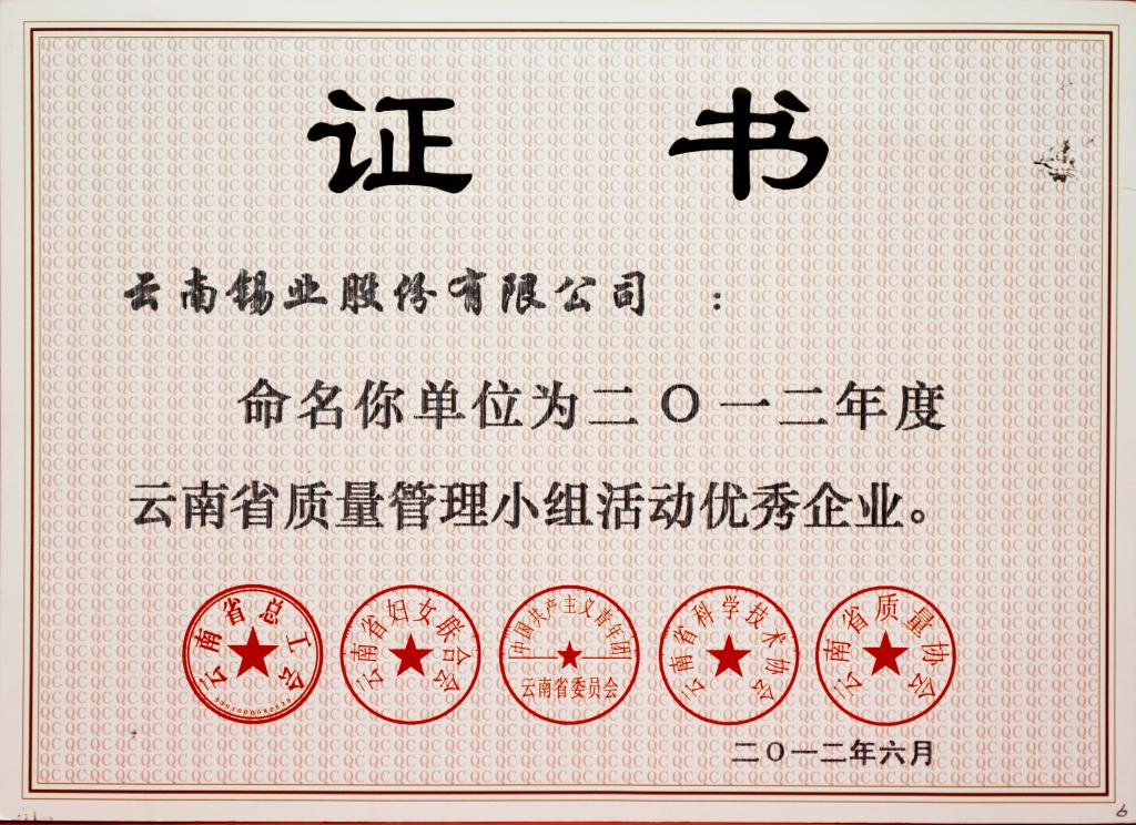 荣获“云南省质量管理小组活动优秀企业”