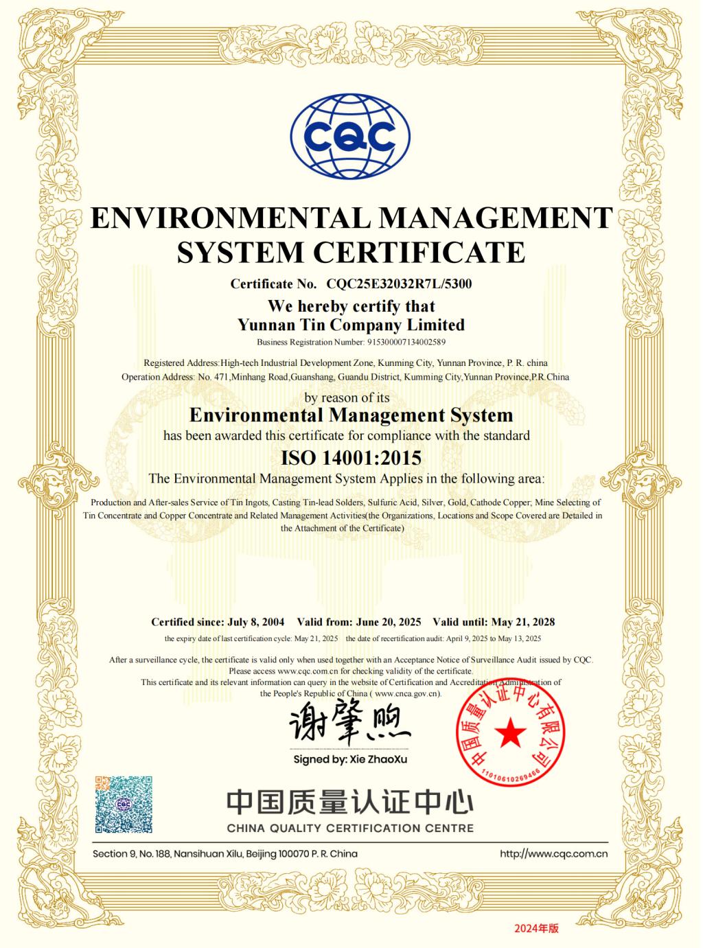 CQC环境管理体系认证证书
