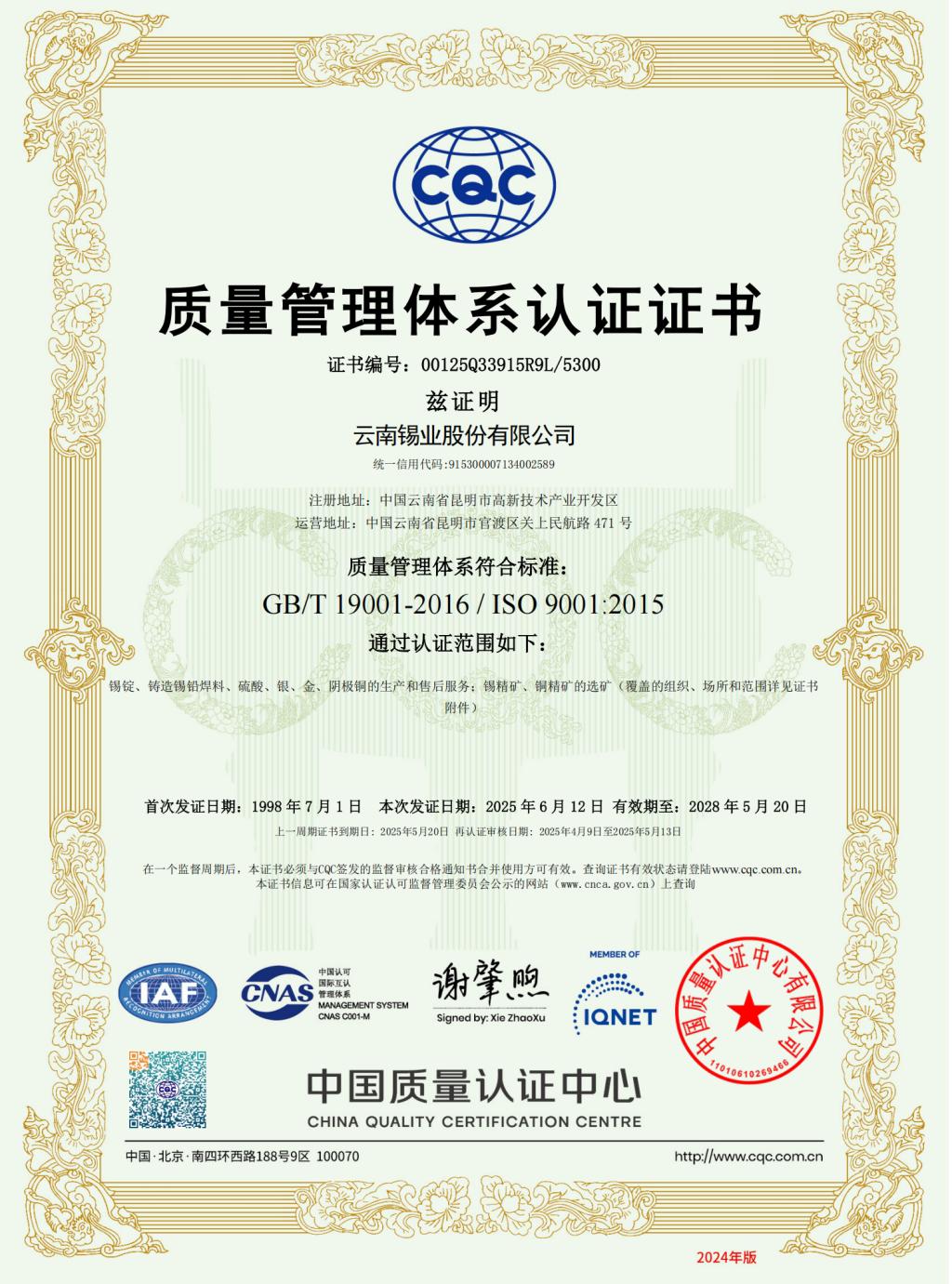 云锡牌锡锭获有色金属实物质量金杯奖