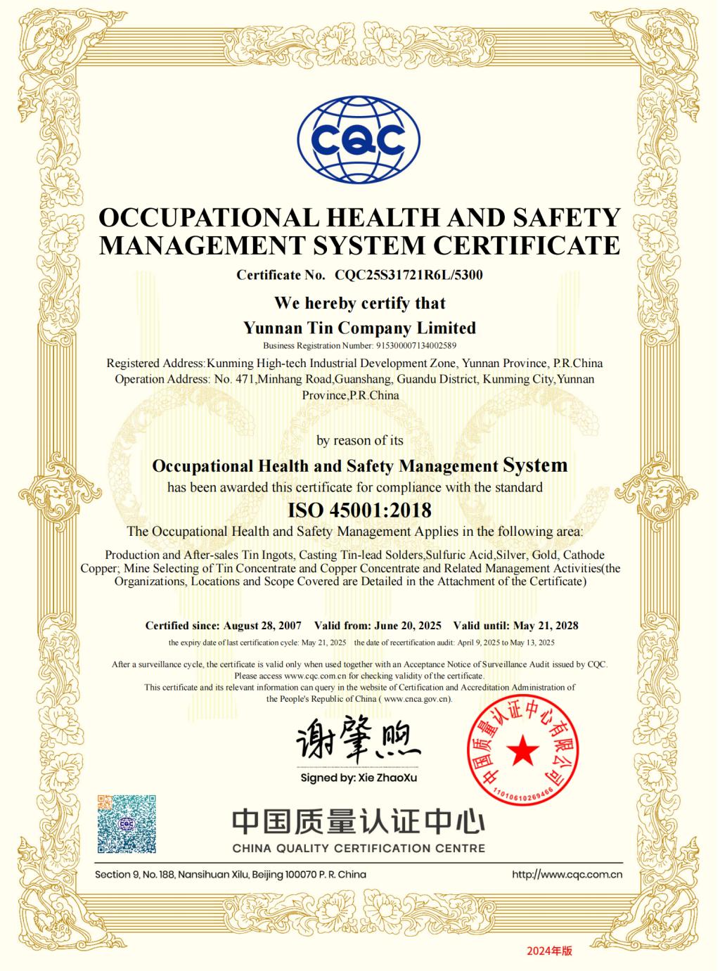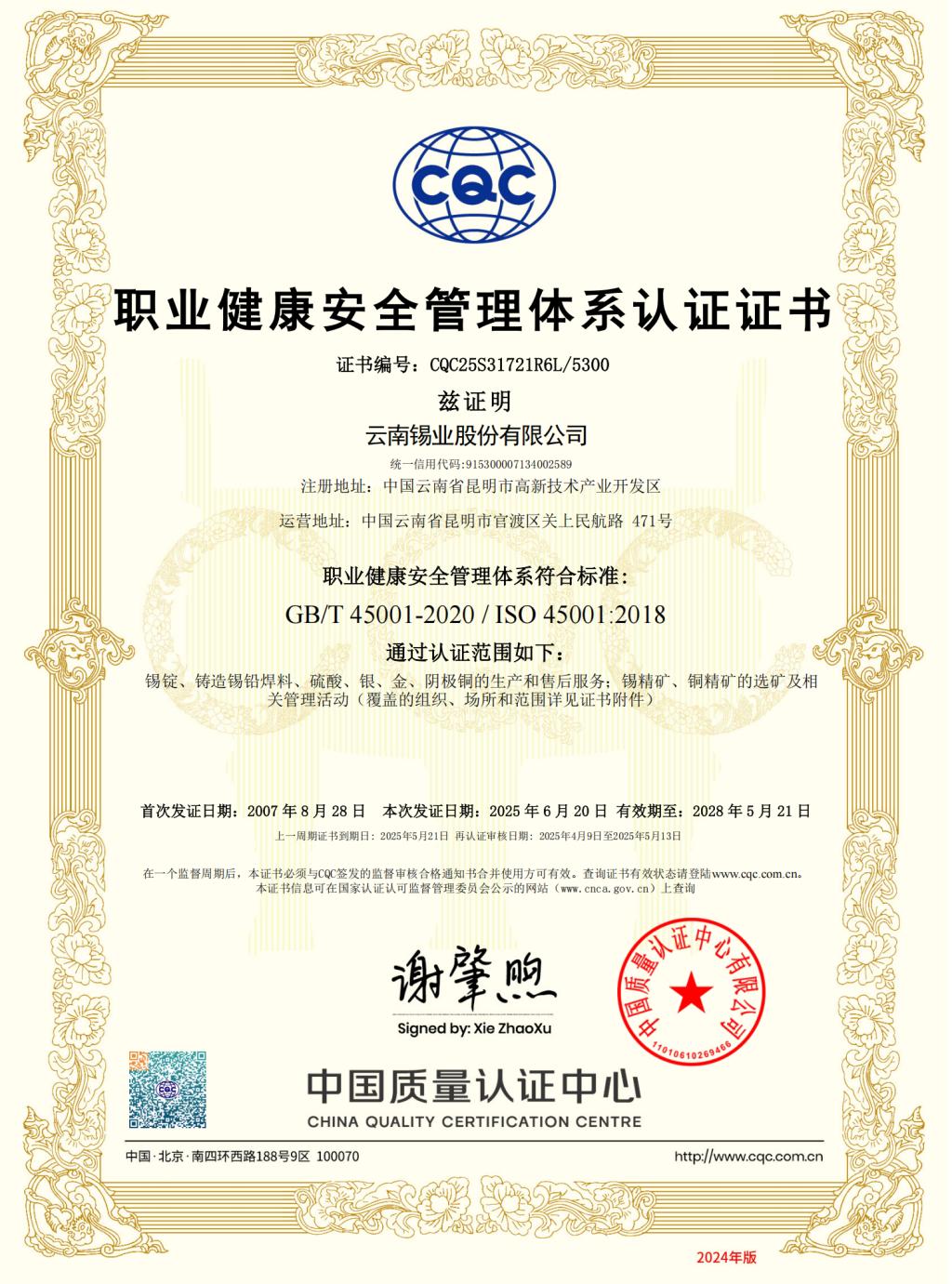 CQC职业健康安全管理体系认证证书