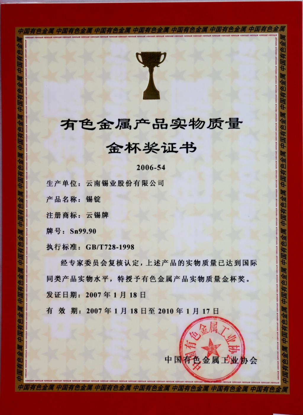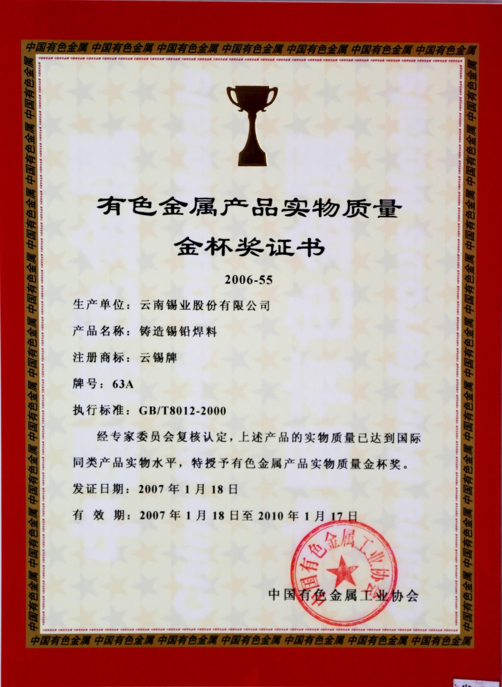 云锡牌铸造锡铅焊料获有色金属产品实物质量金杯奖证书