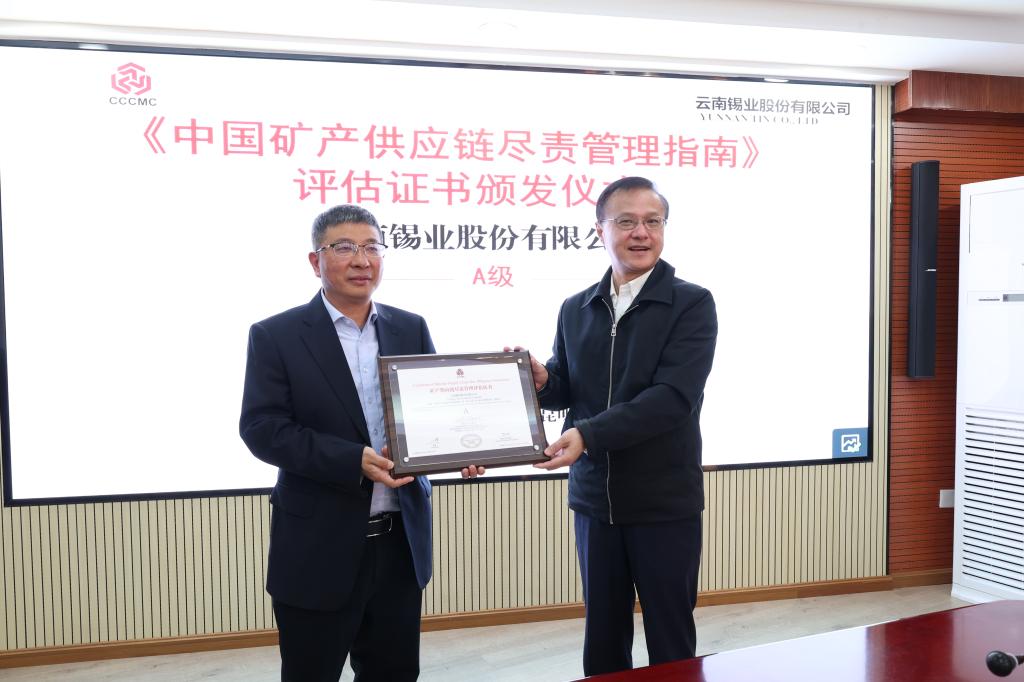 近日,中国五矿化工进出口商会会长江辉、发展部主任孙立会,及伦敦金属交易所负责任工商经理杨茗友一行到访云锡,与云锡控股公司领导杨奕敏、锡业股份党委书记、董事长、总经理刘路坷开展座谈,并向锡业股份颁发《中国矿业供应链尽责管理指南》评估证书。