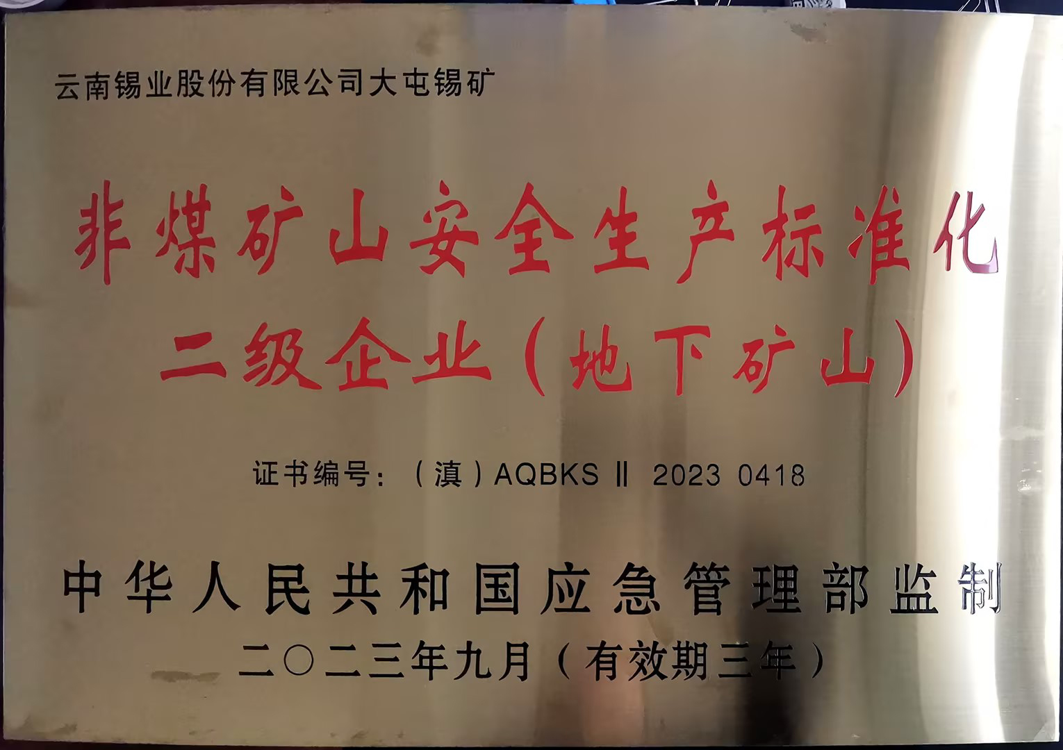 近日,锡业股份卡房分公司、大屯锡矿两家单位收到由中华人民共和国应急管理局监制、云南省应急管理厅颁发的牌匾和证书,正式确认为“非煤矿山安全生产标准化二级企业”,为今后持续稳定发展打下良好基础。