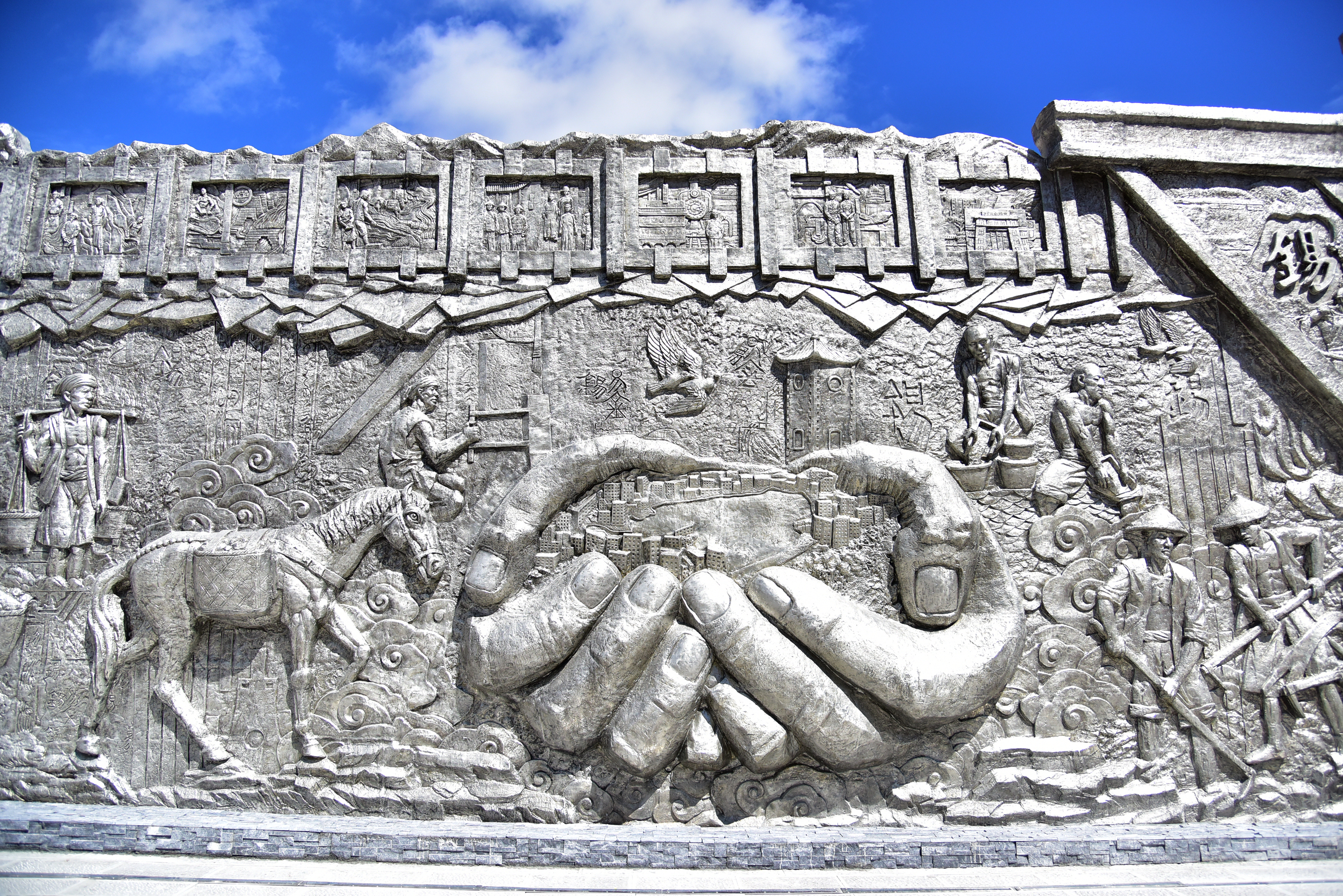 在设计方、施工方和云锡参建单位与制作人员的共同努力下,2021年10月,总长80米、平均高度5.4米的大型锡业文化主题群雕在个旧金湖东路云锡办公大楼门口落成。