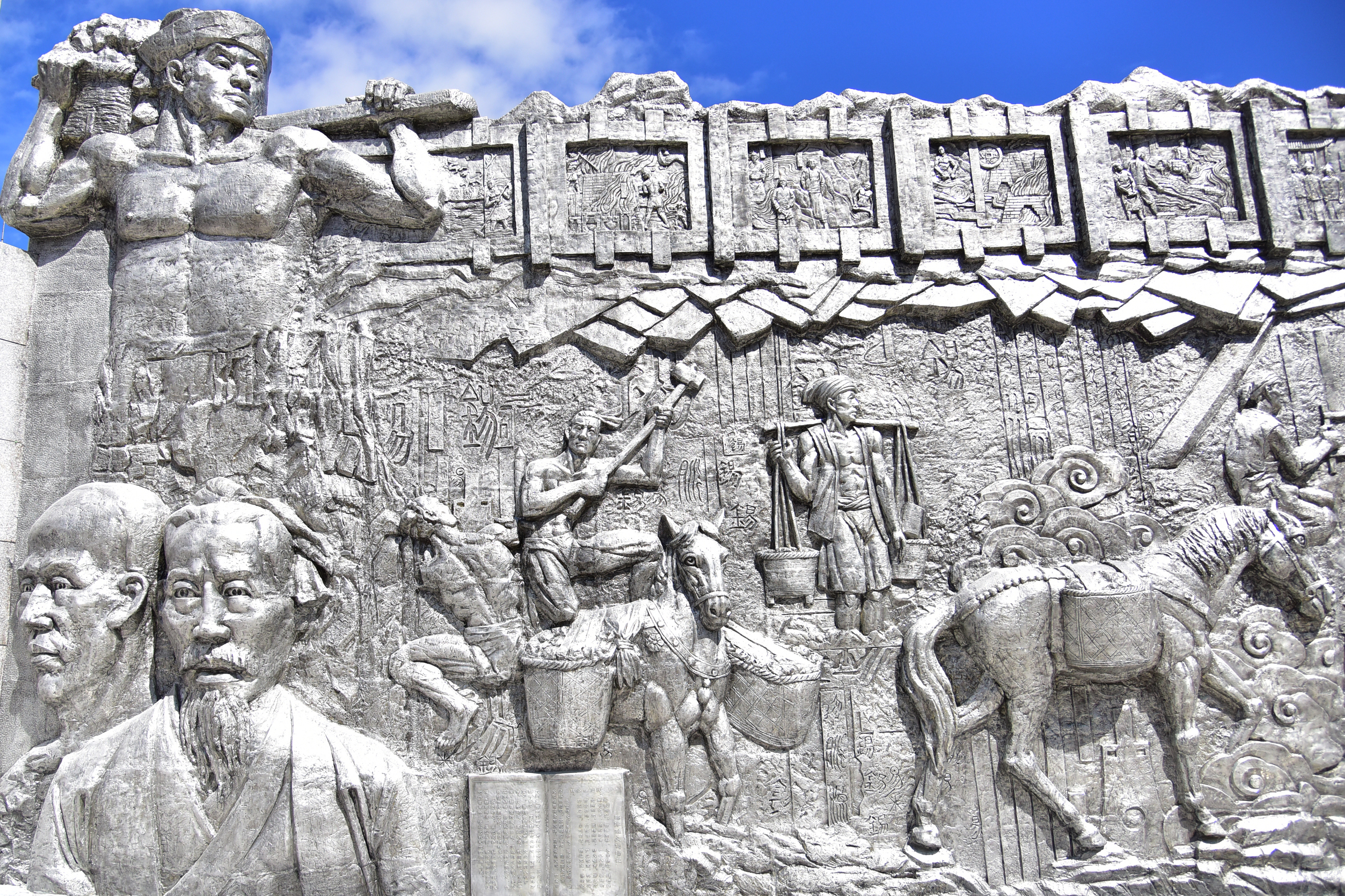 锡文化浮雕原料整体采用云锡冶炼分公司生产的“三九”精锡,由云锡腾升工艺品公司的100多名职工纯手工打造,整个墙面使用精锡近40吨。墙体以云锡标志“YT”为核心,以“锡映千秋”“云腾万里”为主题,分立于云锡个旧办公区大门口两头雄伟的锡狮子一侧。穿越时空隧道,沿着历史轨迹,翊翊如生的锡业先辈和锡矿工人、科技人员,充满动感的锡采、运、选、冶生产场景……一幅灿若星河的巨型锡业发展画卷通过高浮雕艺术的方式展开。