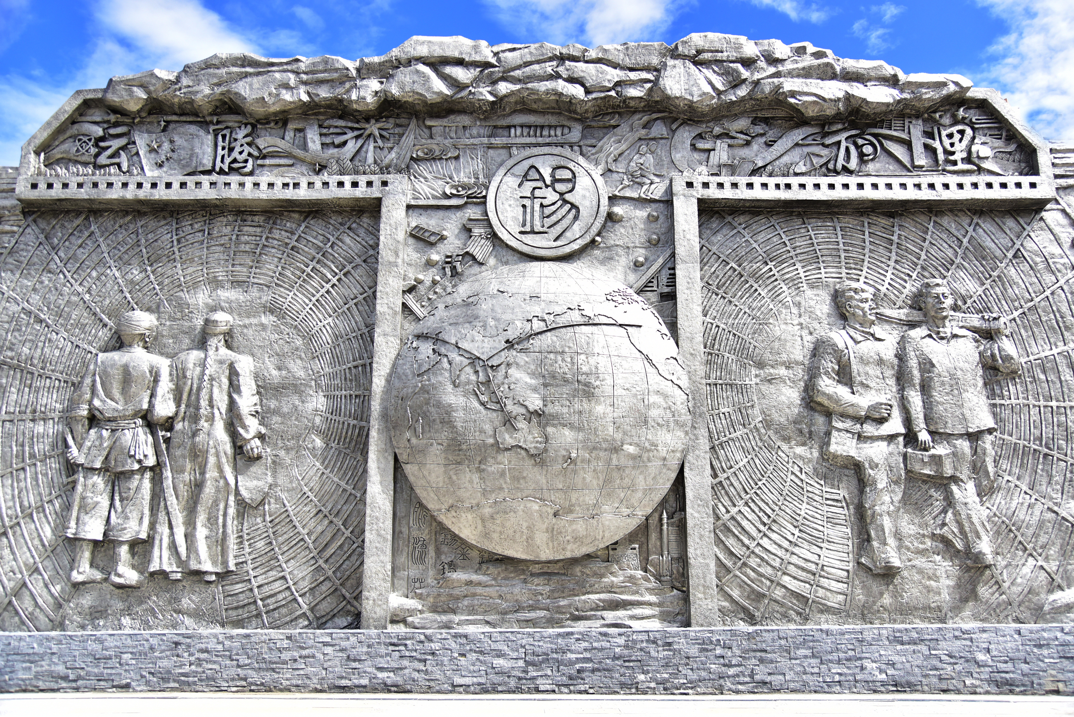 目光如炬的新时代云锡产业工人、尽显家乡民族文化的哈尼梯田、代表美誉溅满中国乃至世界的锡水、艰苦创业的古时锡业人穿越时空走进新云锡、锡产品在高铁和航天产品等行业的广泛运用、助力云锡快速发展的大型工业设备、寓意云锡技术进步的齿轮、寓意云锡全球化发展的地球、寓意引领全球锡业而展翅高飞的雄鹰、高举“YT”品牌以更宽视野注目着未来的云锡人……在以英文字母“T”为中轴的右侧主题浮雕墙上,一组组极具真实感的画面仿佛在描绘着 “云腾万里”的豪迈。