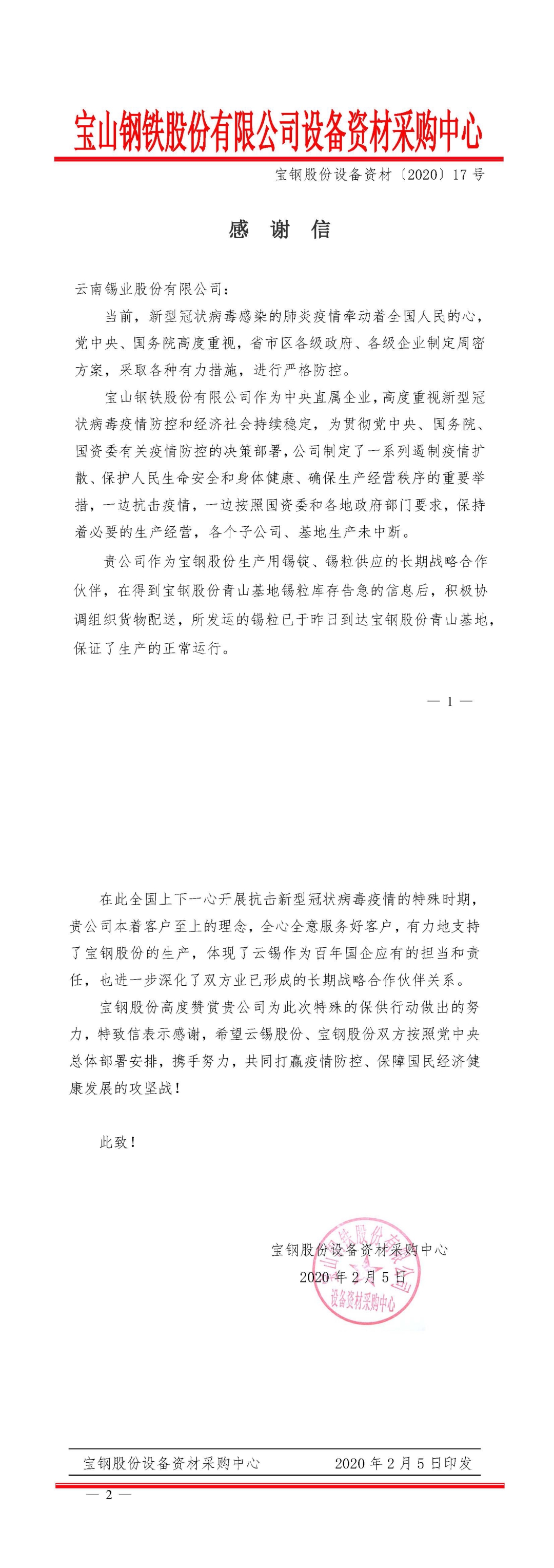 在存在诸多不确定因素的情况下,公司决定抱着尝试的心态进行配送,尽最大努力确保供货。最后,在明确疫情期间需注意事项,确保人员安全的前提下,配送货车于2月2日从昆山出发,最终顺利通过检查关卡,于2月4日将货物安全交付武钢新日铁工厂,配送车辆也在武钢的协助下顺利离开武汉,返往昆山。公司在疫情期间采取特殊方式完成货物配送,得到了客户的高度认可,宝钢表示,患难见真情,感谢云锡对宝钢原料保供的鼎力支持,并为此专门向锡业股份发来了感谢信。