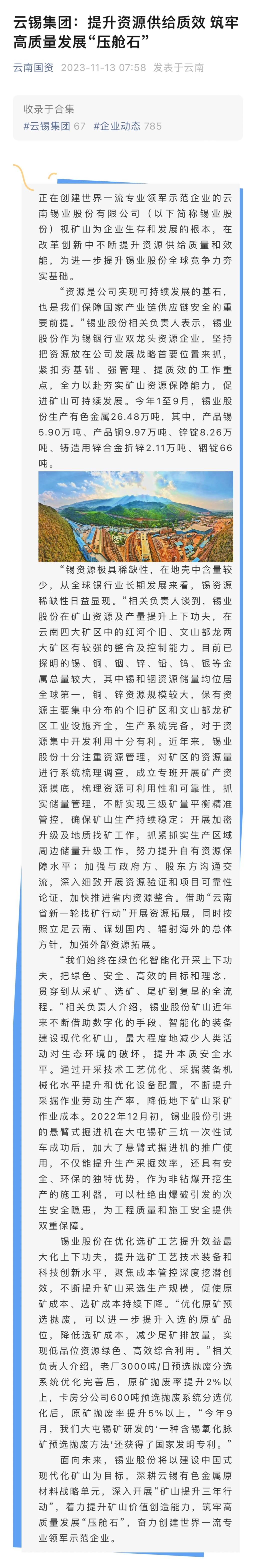 云南国资、中国有色金属报:锡业股份提升资源供给质效 筑牢高质量发展“压舱石”
