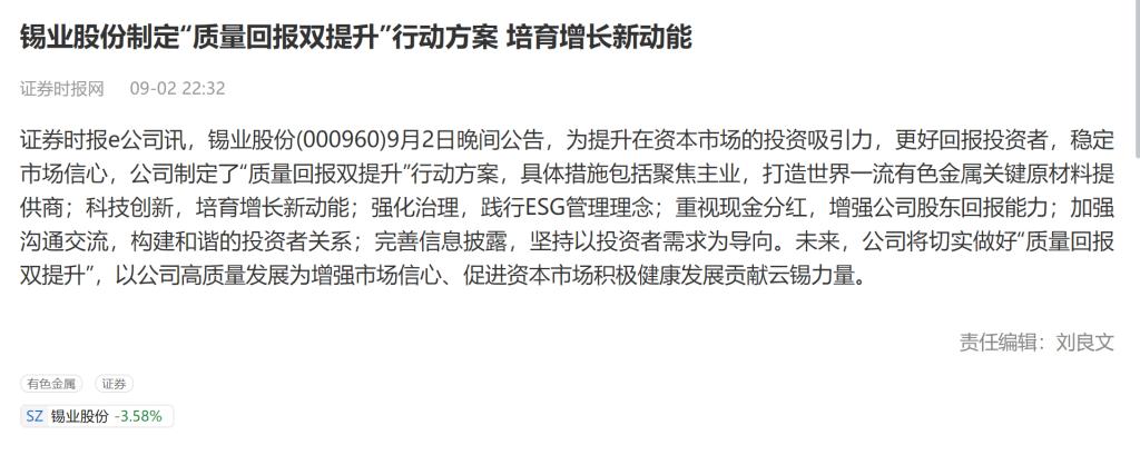 证券时报网:锡业股份制定“质量回报双提升”行动方案 培育增长新动能