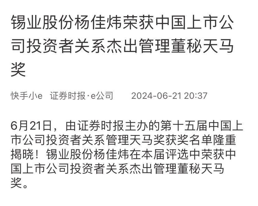 证券时报·e公司:锡业股份杨佳炜荣获中国上市公司投资者关系杰出管理董秘天马奖
