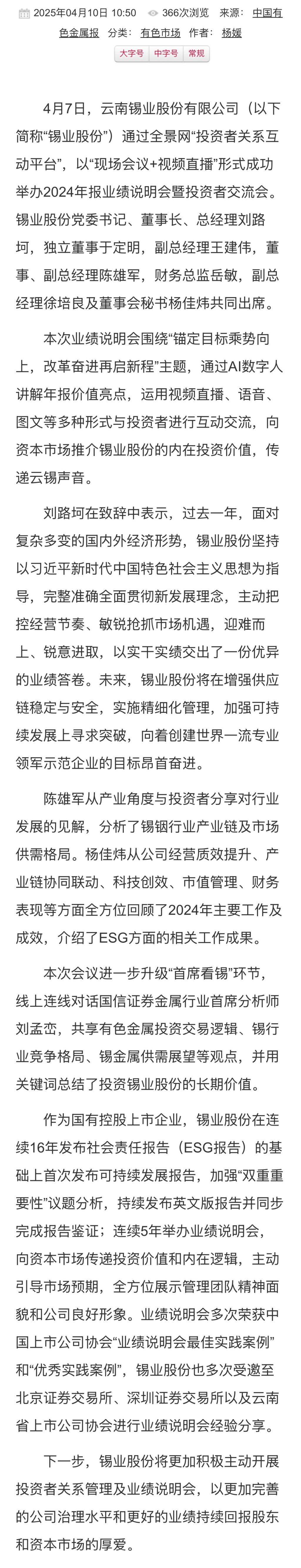 中国有色金属报:锡业股份成功举办2024年报业绩说明会