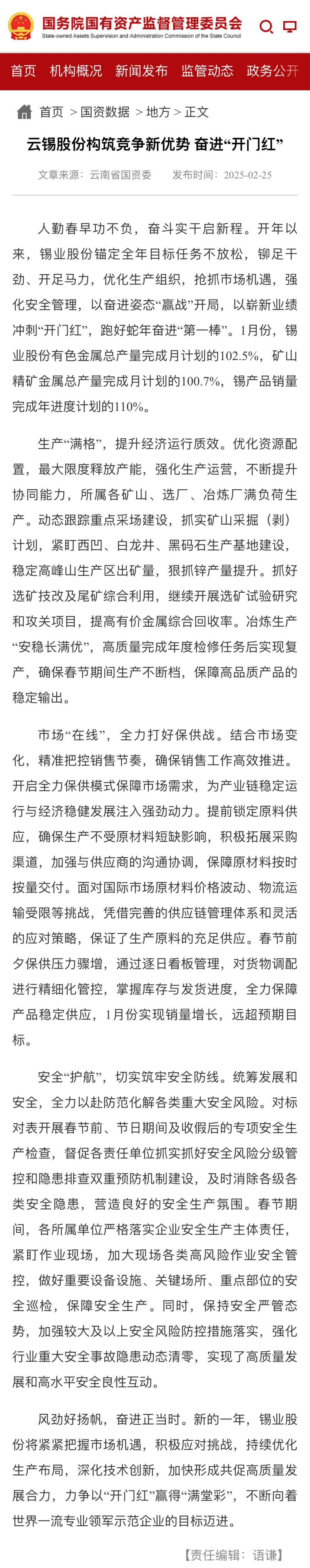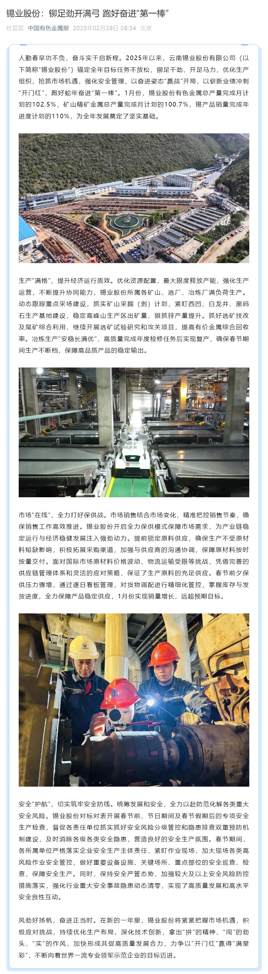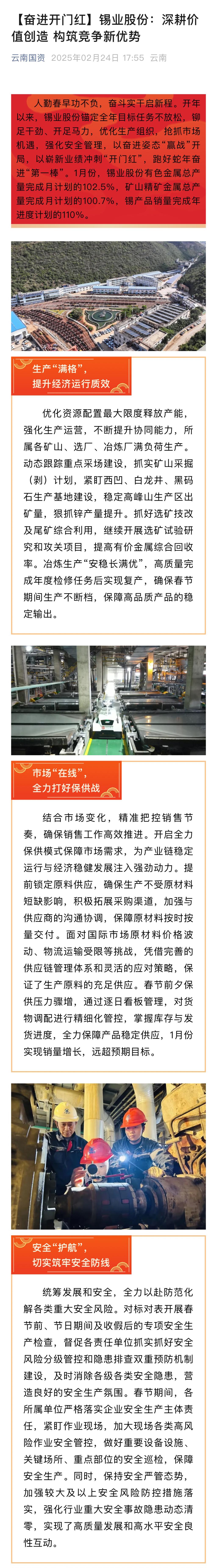 国务院国资委、云南国资、中国有色金属报:云锡股份构筑竞争新优势 奋进“开门红”