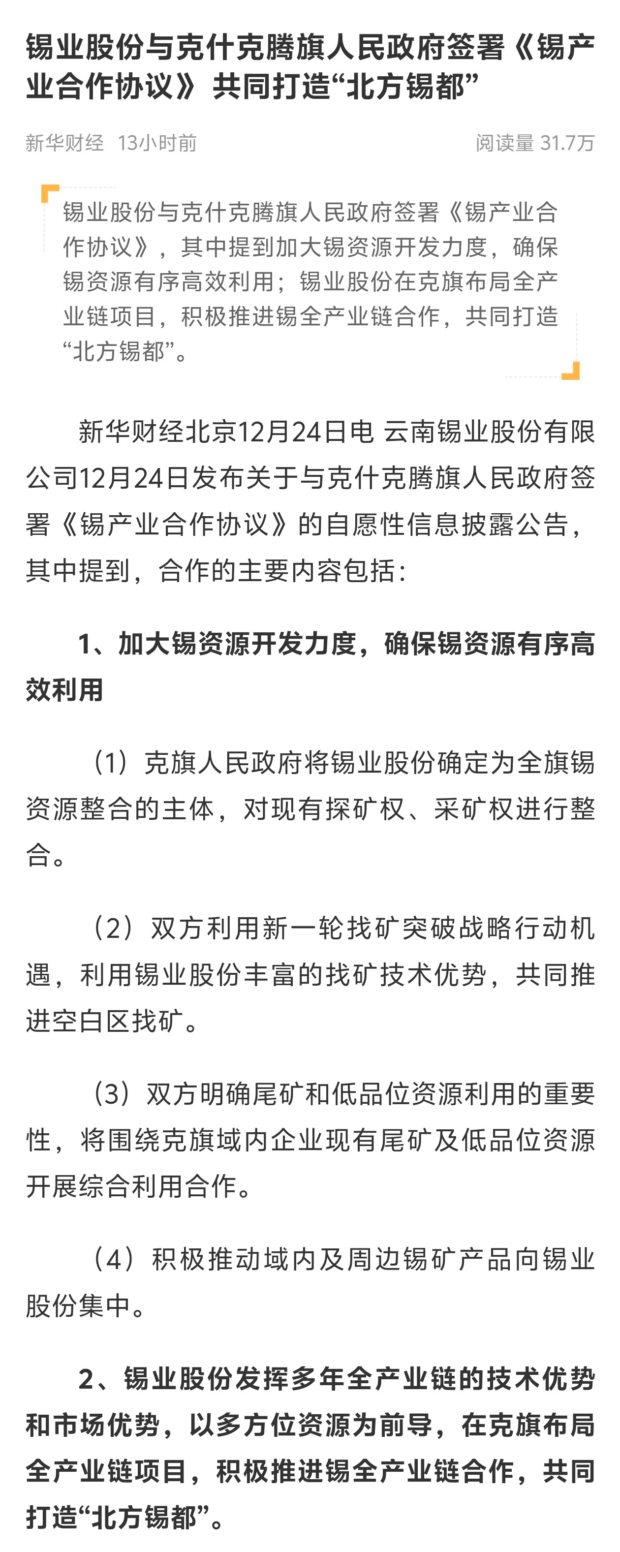 新华财经:锡业股份与克什克腾旗人民政府签署《锡产业合作协议》 共同打造“北方锡都”