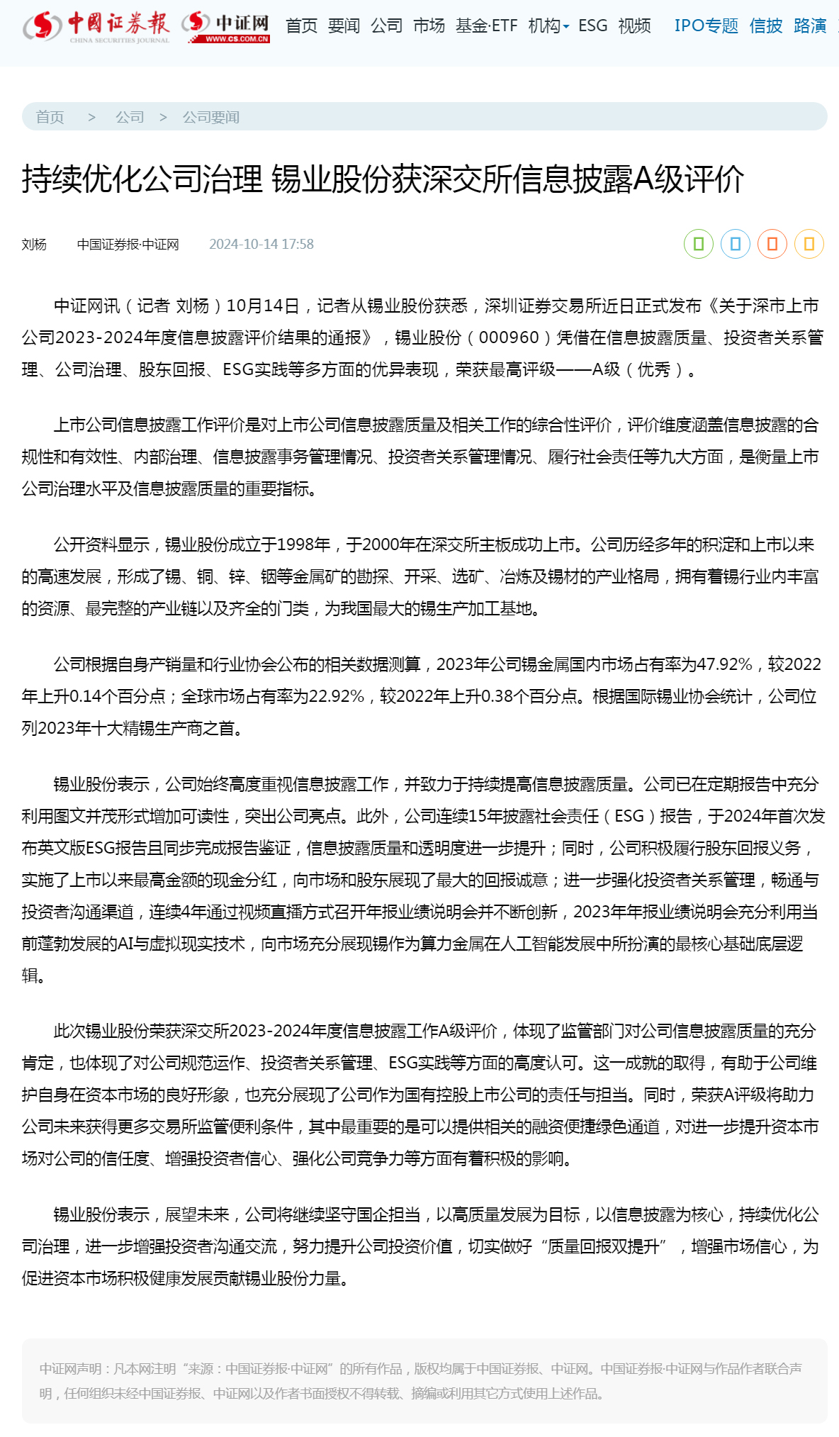 中证网:持续优化公司治理 锡业股份获深交所信息披露A级评价
