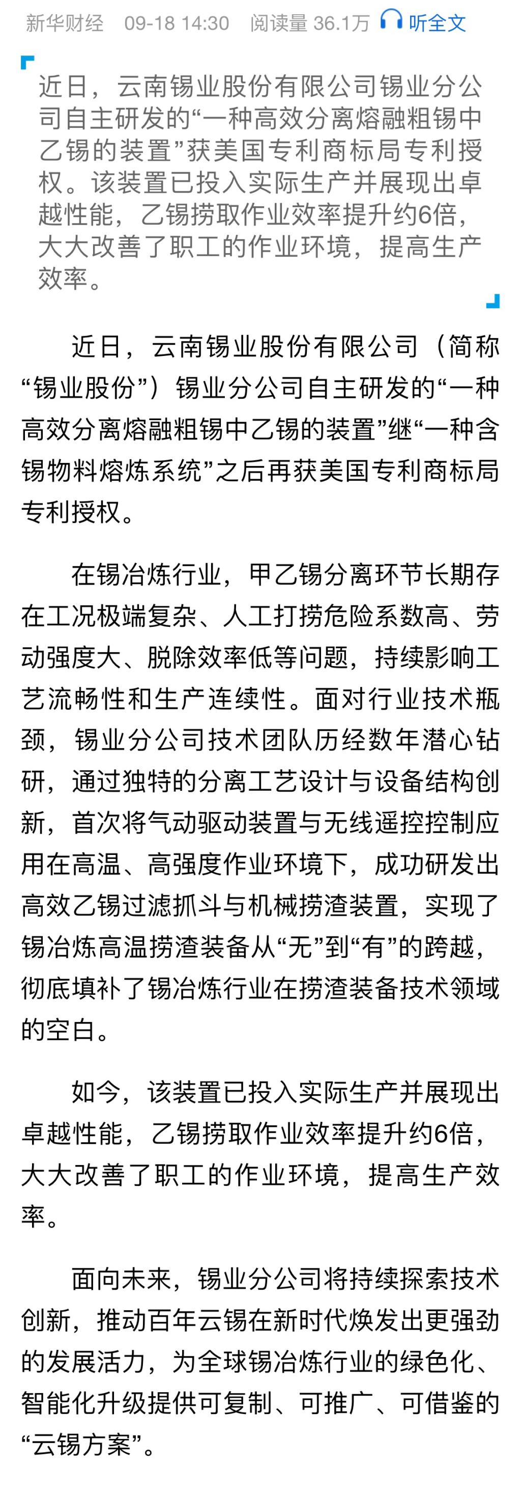 新华财经:锡业分公司创新成果再获美国专利商标局授权