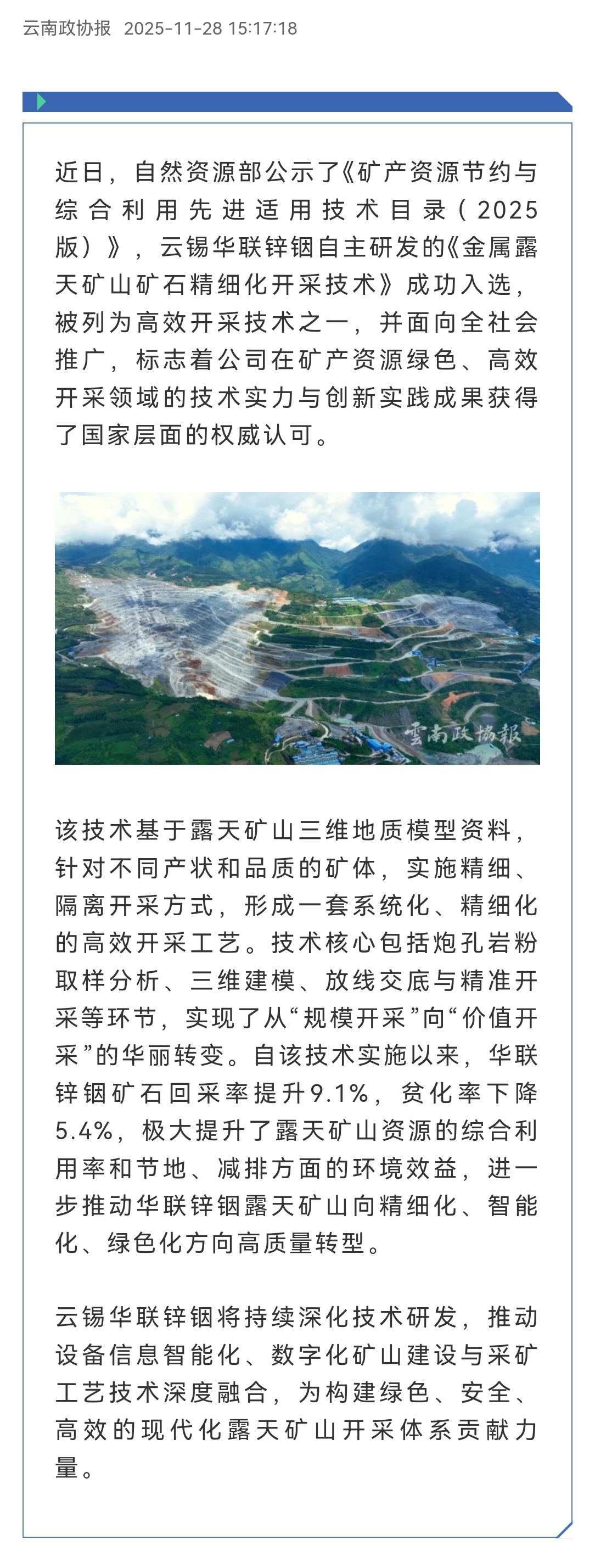 云南政协报:云锡华联锌铟自研露天开采技术入选国家先进适用技术目录