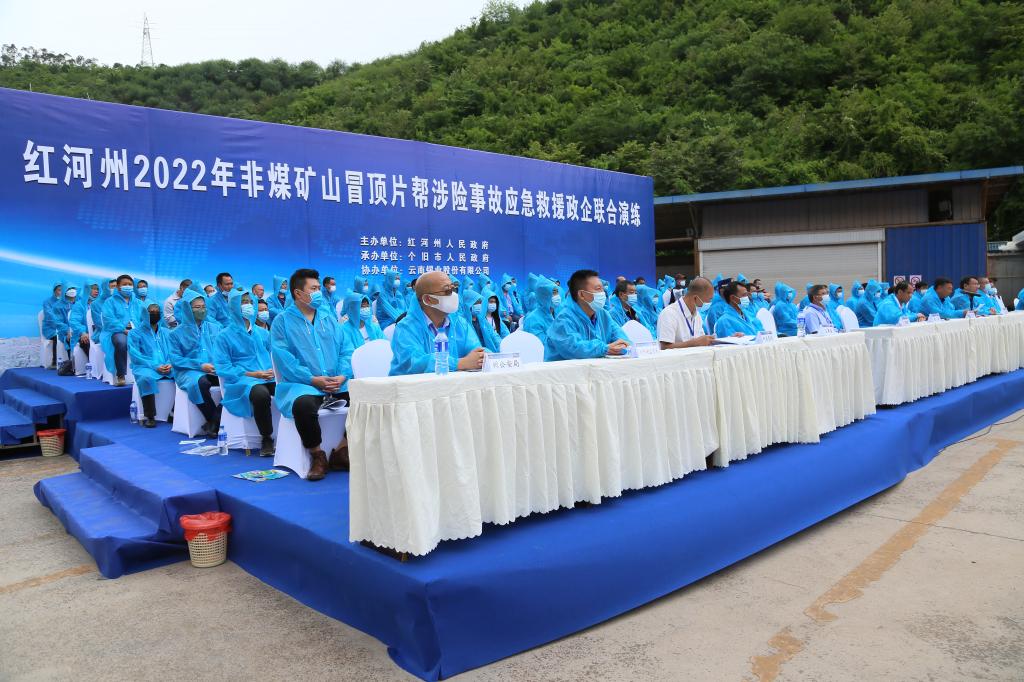 6月23日,由红河州人民政府主办、个旧市人民政府承办、中国·必威(bw·西汉姆联)中文官方网站协办的红河州2022年非煤矿山冒顶片帮涉险事故应急救援政企联合演练在大屯锡矿举行。认真学习贯彻落实习近平总书记关于安全生产重要论述,推动各级应急管理责任落实,压实安全生产责任,切实提高红河州非煤矿山事故应急救援能力。红河州人民政府副秘书长杨克平,红河州应急管理局局长张锰,锡业股份党委副书记、董事长、总经理刘路坷,锡业股份党委委员、副总经理王建伟,锡业股份党委委员、大屯锡矿党委书记、经理王寿安等出席演练活动。