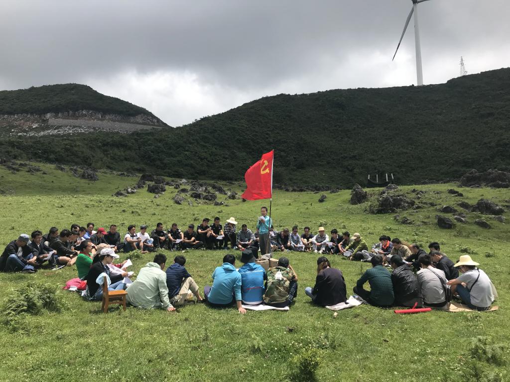 当天,朝阳燃烧着晨雾,清晨的空气中带着些许热意。一坑的60名党员在党旗引领下,浩浩荡荡向目的地进发,徒步路线从2095老矿区开始到猴子山风力发电站脚,共约15公里。路途中,曾在老矿区待过、年纪稍长的党员们,指着一处处老旧破败的建筑向年轻人介绍:“看,那里叫小街子,以前特别热闹,人很多”;“那是以前的粮食局”;“以前我们家就在炮台旁边的那幢房子里”……这就是老矿山人曾经生产和生活过的地方,随着资源的消失、生产中段不断下降,老矿区已逐渐衰落萧条;曾经热闹熙攘的小街子、电影院、粮食局现在已无生气,渐渐被人们遗忘。年轻党员们看到这些景象,听着前辈们讲述曾经打拼的故事,纷纷表示要传承好老一辈矿山人艰苦奋斗的精神,珍惜大好机遇和矿产资源,为大屯锡矿的建设发展不懈努力。