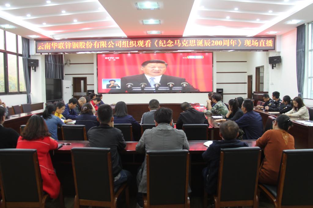 华联锌铟公司党委组织150余名干部员工在公司五楼会议室及各车间会议室集中收看纪念马克思诞辰200周年大会直播,在认真聆听习近平总书记重要讲话后,广大党员干部群众备受鼓舞,纷纷表示,在以后的工作中,将切实把习近平总书记重要讲话精神贯穿到各项工作中去,进一步增强“四个意识”,坚定“四个自信”,不断增强责任意识,立足本职,为公司下一步的发展贡献自己的力量。(张引娣)