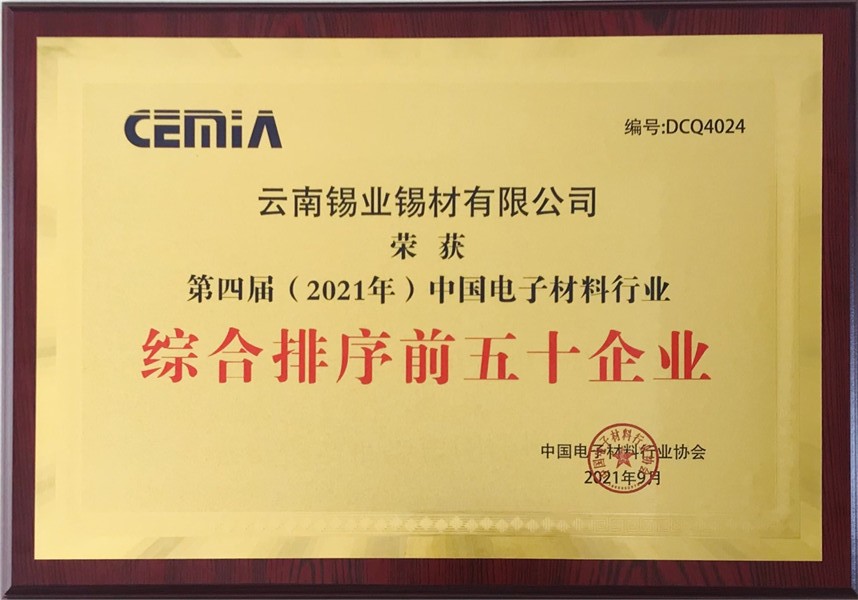 锡材公司荣获第四届(2021年)中国电子材料行业协会两项荣誉