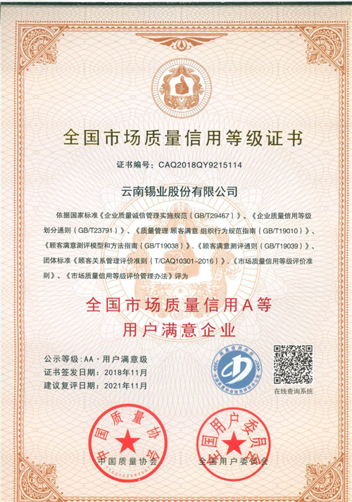 锡业股份荣获“2018全国市场质量信用AA等用户满意企业”荣誉证书