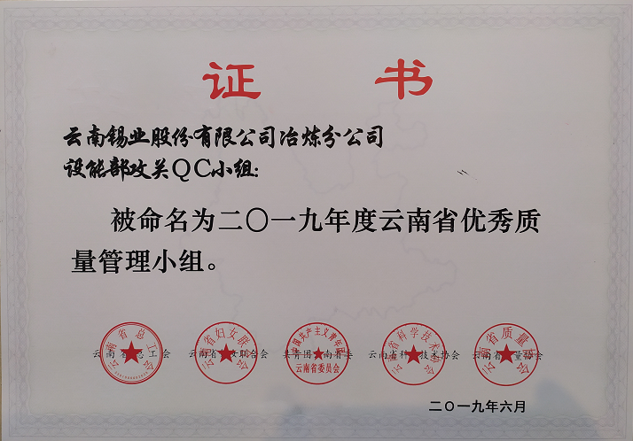 6月27日,在云南省第41次质量管理小组暨质量信得过班组代表大会上,冶炼分公司设能部攻关QC小组荣获“云南省优秀质量管理小组”荣誉称号,熔炼车间沸腾炉班组荣获“云南省质量信得过班组”荣誉称号。