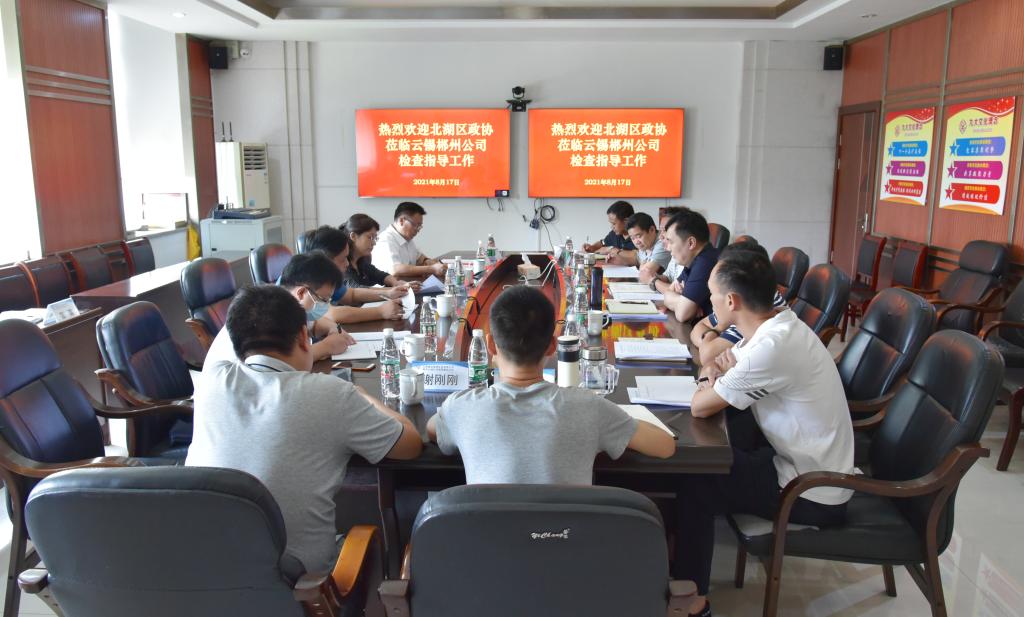 8月17日,郴州市北湖区政协主席黄晨峰率队调研云锡郴州公司,深入了解郴州公司当前生产经营情况和下一步锡产业转型升级的工作规划。