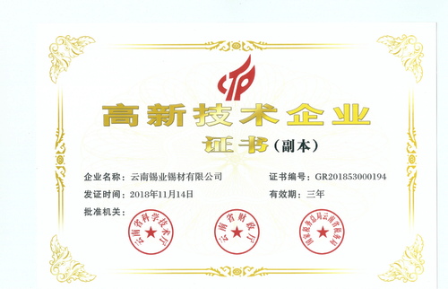 2018年,锡材公司经过评审、公示,再次获得认定,取得“高新技术企业证书”。自2009年锡材公司首次申报高新技术企业并获得认定开始,已连续四次申报成功,一共连续12年位居高新技术企业之列。锡材公司申报高新技术企业由研发分中心牵头,在财务部、组织人力资源部等部门的配合下,完成了认定材料的编制及提交,经过各级政府专家评审、审查认定、公示、备案及“高新技术企业认定管理工作网”公告等程序,最终由认定机构颁发证书...